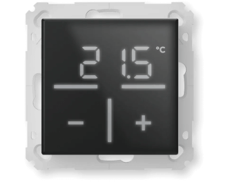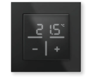 Het display kan naar wens de gemeten of gewenste temperatuur tonen. Te bedienen met + en - touch knoppen voor instellen van de gewenste temperatuur.
